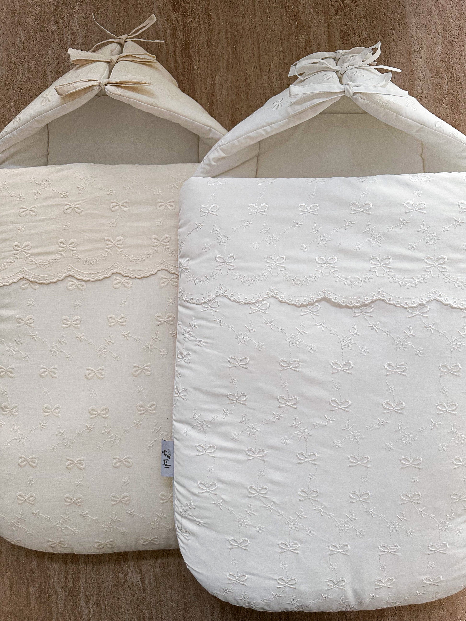 مدس مواليد ناعم بلون أوف وايت وكريمي مطرّز بفيونكات أنيقة، يمنح طفلكِ دفئًا ولمسة رقيقة
