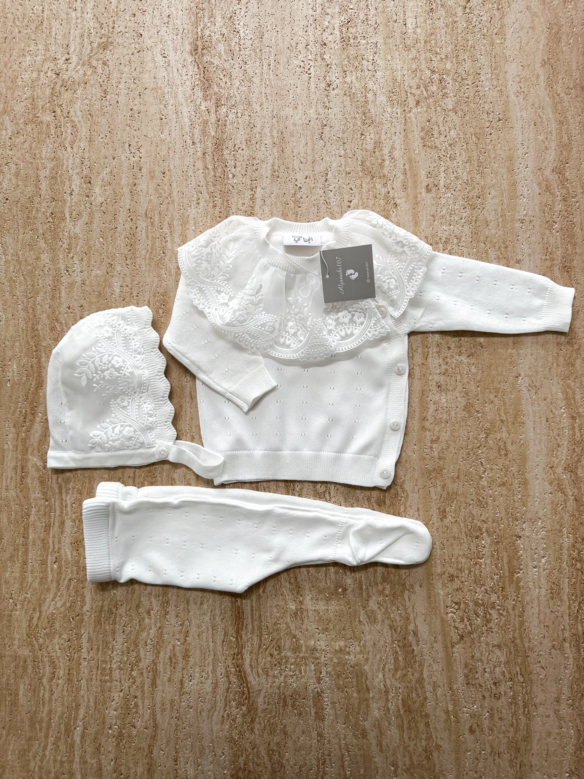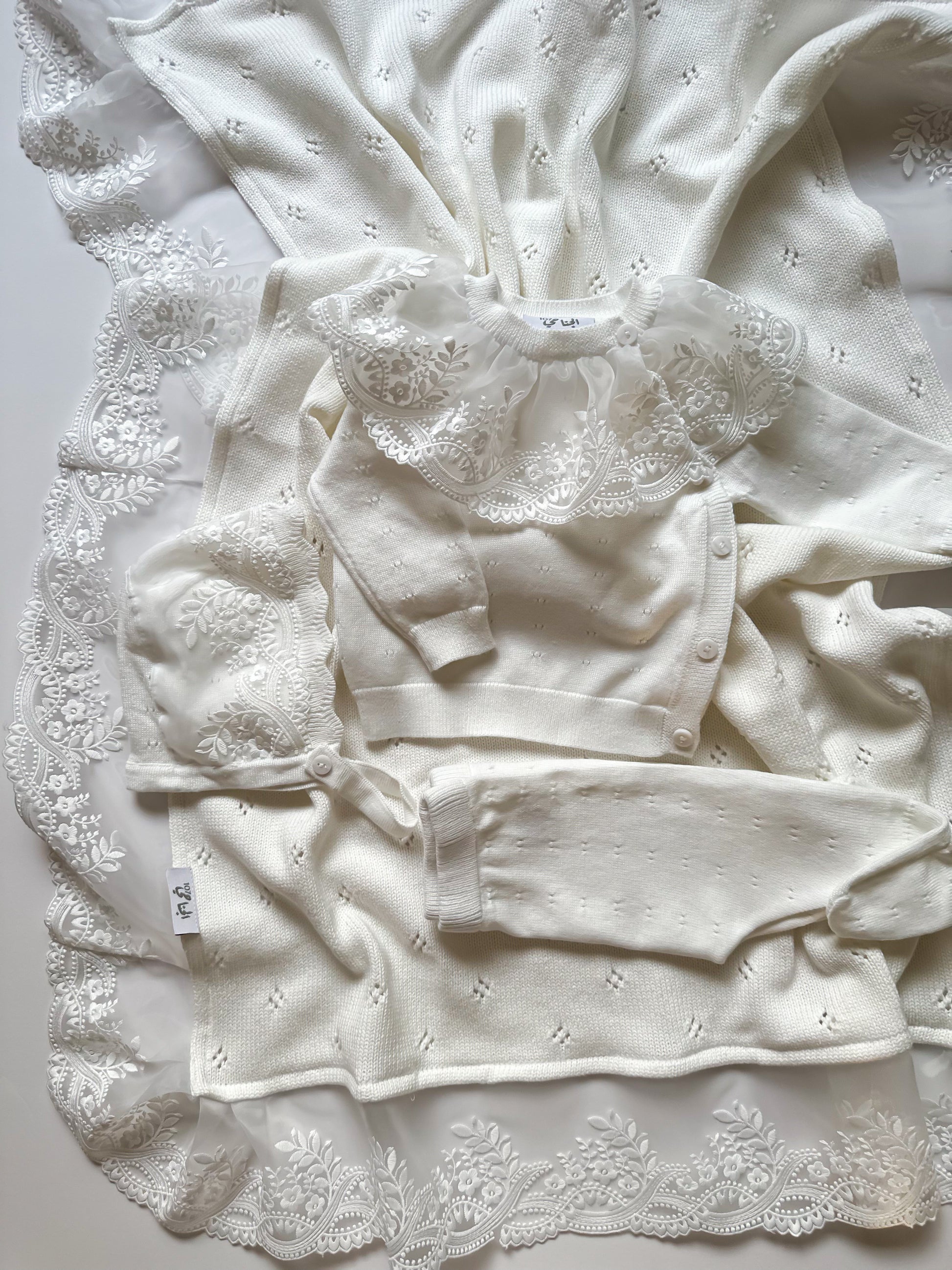طقم مواليد فاخر من أربع قطع باللون الأبيض الناعم، مصنوع بعناية من قماش مريح مع تطريز دانتيل راقي. يتكوّن من كنزة ناعمة بأزرار جانبية، سروال مريح مع أقدام مدمجة، قحفية مطابقة مطرزة، بالإضافة إلى لحاف أنيق يكمل الإطلالة. تصميم متكامل مثالي لهدايا استقبال المولود، يجمع بين الأناقة والعملية والدفء